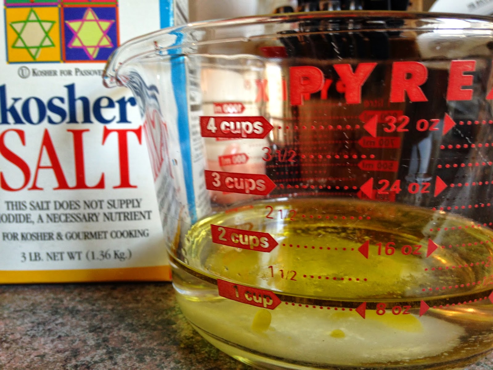 | Left to right: Kosher salt and Pyrex cup (water, oil, sugar) |
